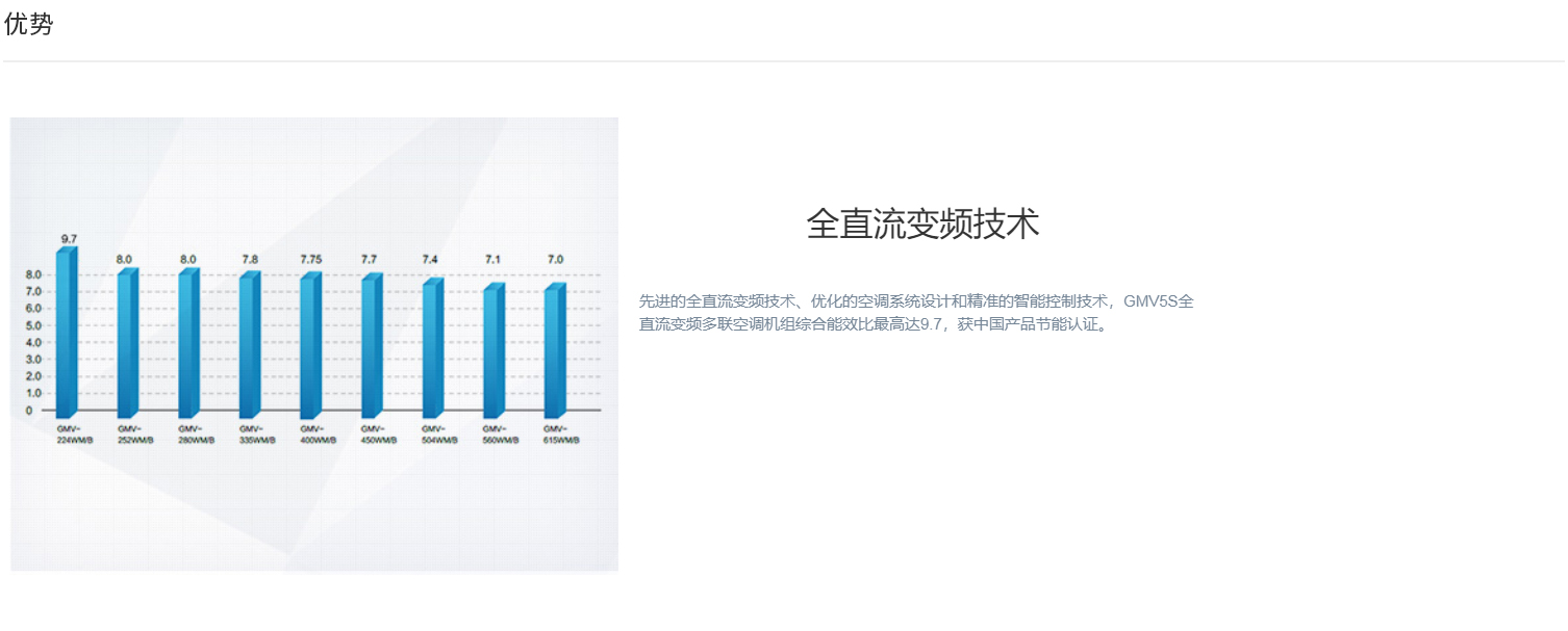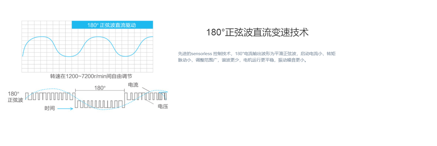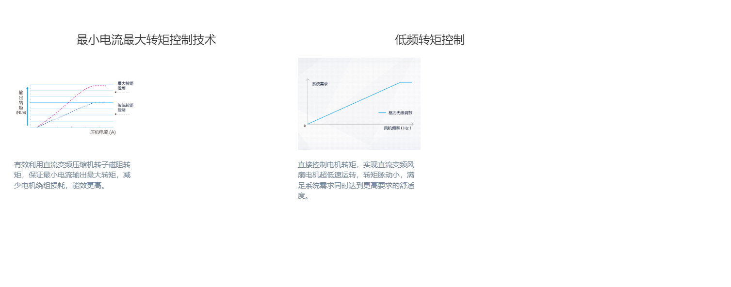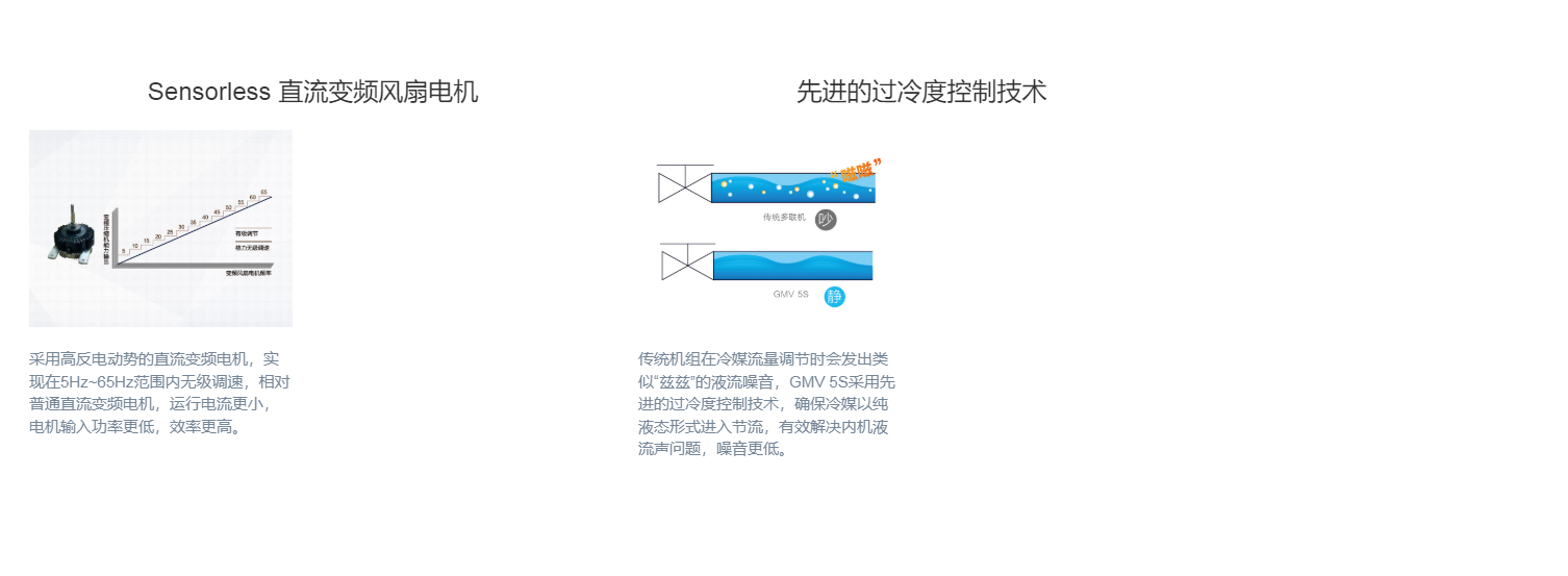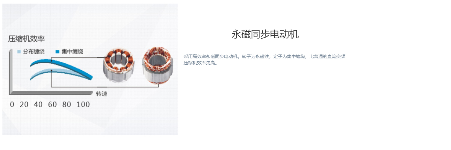 全直流變頻技術(shù)、永磁同步電機(jī)、直流變頻壓縮機(jī)、過冷度控制技術(shù)、180°正弦波直流變頻技術(shù)、雙節(jié)能運(yùn)行模式、制熱不換向回油